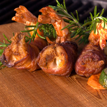 Wrap shrimp with bacon and skewer with toothpick. Sauté onion, mushrooms and pepper in canola or olive oil. Add a dash of steak sauce; stir. Lightly sauté shrimp/bacon skewers until done, no more than 5 minutes.